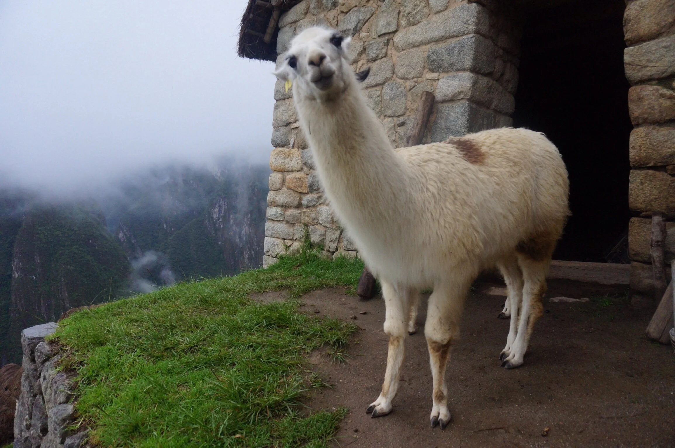 The girls decided that the weather couldn’t stay cloudy forever, and so they took shelter in a roofed building until the clouds finally parted and they could actually see Machu Picchu and it’s surroundings. Out came the Santa hats the girls had brought, and they were a sensation. Many, many photo shoots occurred with those Santa hats. Well done girls, spreading Christmas joy on December 24. The girls even managed to find an alpaca (or a llama, it’s hard to know which is which) and tried to hug it.